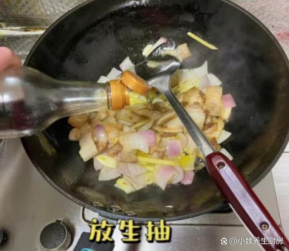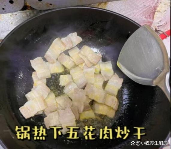4:锅底调入少许食用油,让油温烧至7成热,倒入五花肉煸炒出油脂,放入一些蒜苗,姜丝和洋葱,用锅铲迅速翻炒均匀。