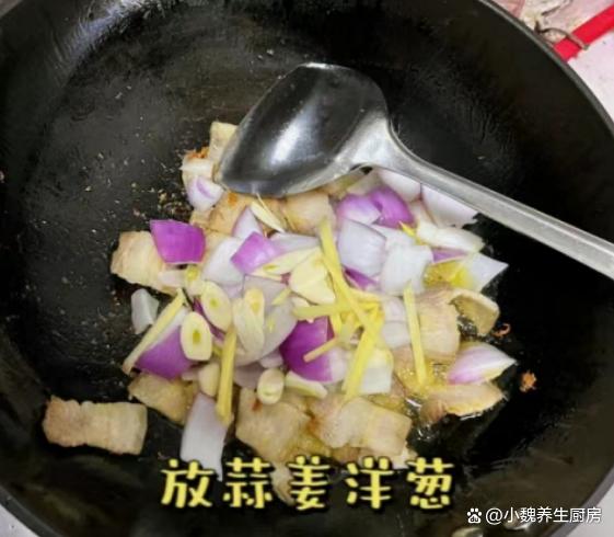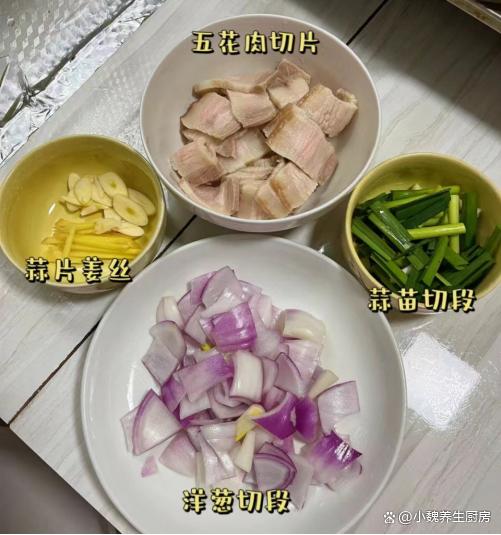 进入12月最后几天,今年过得非常顺利,12月份前期非常忙碌,到了月末才开始空闲起来,有足够的时间给家里人做饭,作为家里做饭的家厨,每天要安排一日三餐,为孩子搭配饮食,每天都不能重样。随着我们生活条件越来越好,吃山珍海味都吃腻了,外卖吃起来也不健康,不如自己在家做饭吃,每天晚餐有四菜一汤,讲究荤素搭配,而且要照顾好一家人的胃口。元旦即将要来临了,这个时候是最冷的时候,南方地区的气候很特殊,非常阴冷潮湿,会让人浑身无力,气色非常差,胃口也不太好。今天推荐一道非常美味的菜肴——蒜苗洋葱炒回锅肉,简单炒一锅,好吃不贵,超级下饭。元旦前后,这菜记得岔着吃,解馋开胃,营养美味,别不懂吃。  【蒜苗洋葱炒回锅肉的食谱解析】 食材明细:挑选几根新鲜青蒜苗(许多人称他为蒜叶,叶片分成嫩绿,还散发出独特的香味,能够激发菜肴的香味,让人很有食欲),新鲜紫洋葱一个(洋葱是一种很常见的配菜,色泽为紫红色,有一定的刺激味道,可以作为配菜食用),新鲜五花肉350克左右(五花肉是猪肉的部位之一,分为肥瘦五层,肉质鲜嫩,肥而不腻,是做回锅肉的最佳选择),新鲜香葱几根,若干瓣大蒜头,食用油若干,生姜半块,生抽和老抽少许,豆瓣酱一勺,少许白糖和食盐,其他佐料。