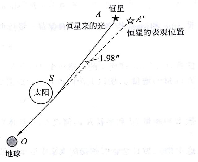 我在前面的文章()也计算了牛顿理论和广义相对论所对应的行星轨道方程。我们可以看到,广义相对论的结果比牛顿理论的结果多了一个附加项,而这一项刚好可以解释43''的差值。除此之外,前面的项还要依靠牛顿理论计算更加方便。 光线偏折广义相对论认为,太阳的存在使时空发生了弯曲,零测地线不再是直线,从而无穷远处的观察者会觉得光的运动发生了偏折,不再是直线。1919年,爱丁顿利用日全食的机会进行了光线偏折实验,得到了1.89''的结果,支持了爱因斯坦的广义相对论。