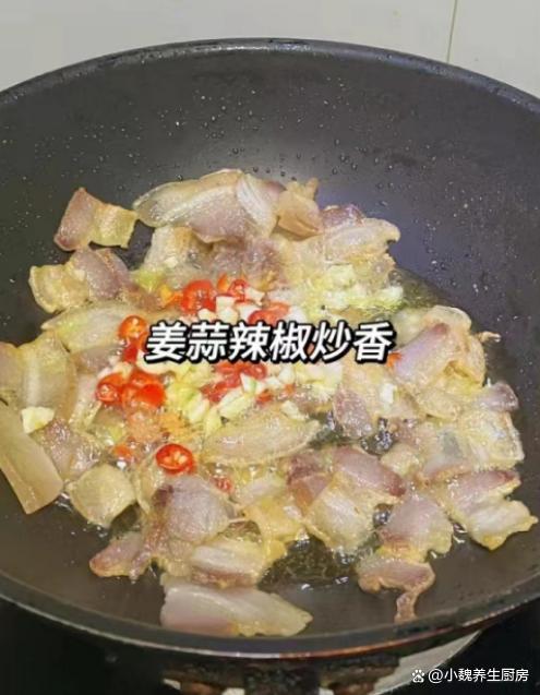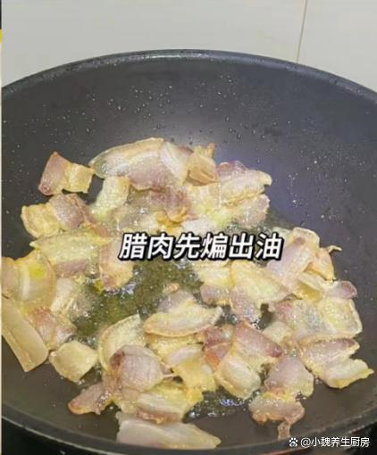 5:锅底慢慢烧热乎,加上适量植物油,让油温烧热至7成热,倒入一些腊肉煎一会儿,把肥腻的油脂煸炒出来。