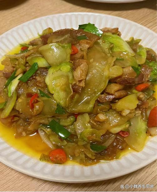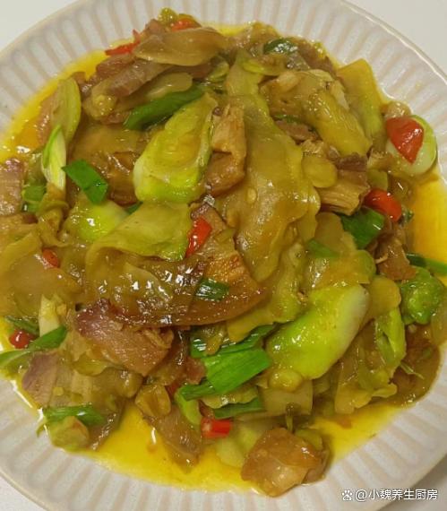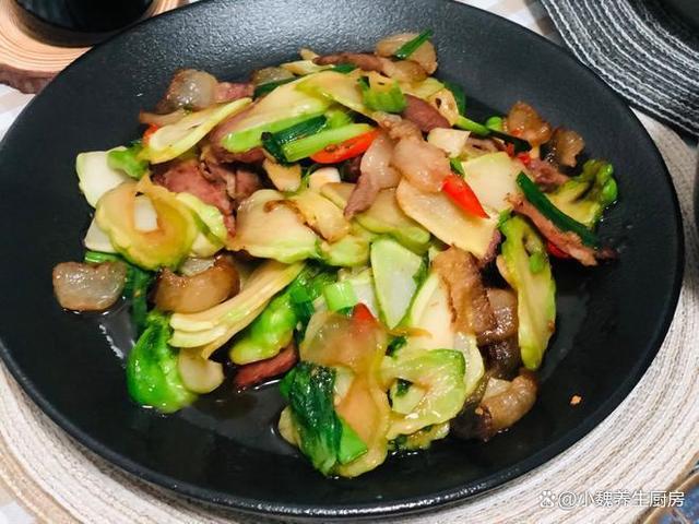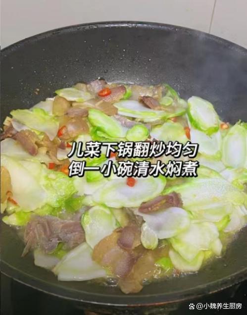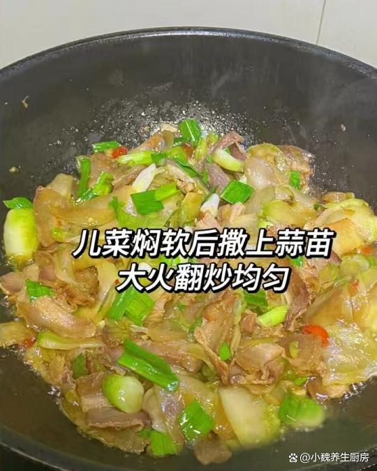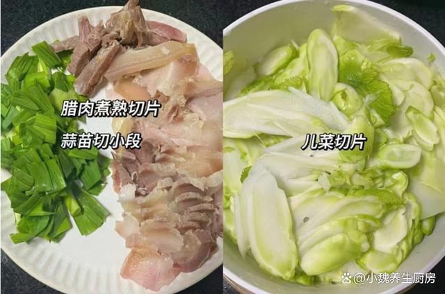时间转眼即逝,很多人还在回味秋季,冬季就已经过半了,已经到了12月月底,马上要结束兔年,即将要迎来龙年,相信未来会越来越好,生活越来越富裕。每年到了12月份,都处于最冷的阶段,许多长辈们称为“数九寒天”,这个时候早上会打霜和结冰,经过寒冬的考验,许多蔬菜会更加好吃,比如说白萝卜,白菜和儿菜等等。冬天天气转凉,晚餐不知道吃什么,不如给家里人尝尝这道家常菜——蒜苗儿菜炒腊肉,做法非常简单,闻起来特别香,解馋又开胃,全家人都爱吃。冬天使劲吃这菜,12分钟搞定,营养又解馋,一上桌就光盘了。  【蒜苗儿菜炒腊肉的食谱解析】 食材清单:选购若干根新鲜蒜苗(蒜苗是冬季常见的配菜之一,蒜苗闻起来特别香,叶片含有大蒜素和微量元素,当成配菜非常不错,一般用来搭配腊肠和腊肉,吃起来巨下饭),选购新鲜儿菜300克左右(儿菜是四川人最爱的蔬菜之一,儿菜吃起来特别清甜,一般可以荤素搭配,吃起来非常解馋开胃),小米辣若干个,食用油少许,冷水少许,半勺白糖,鸡精一勺,适量食盐,姜蒜少许,一大块优质腊肉,生抽和蚝油少许,其他调味品。 正确做法: 1:提前选购好蒜苗,儿菜和腊肉等食材,先把几根蒜苗去掉根须,反复清洗干净,只需要蒜苗的叶子,蒜苗切成若干小段,备用。 2:把大蒜头拍扁,去掉蒜衣后切碎成细末,生姜切成细末,小米辣洗净去蒂,切成若干小圈,备用。3:剥掉儿菜的叶鞘,切掉老一点的根茎,儿菜切成厚度相同的片,锅中煮一小锅清水,加上一勺食盐,倒入儿菜焯水一会儿,让儿菜的口感特别脆口,也不好损害其营养价值。4:腊肉用淘米水浸泡,清洗掉表面的灰尘,另外起锅加上冷水,放入腊肉煮几分钟,捞出用冷水浸泡,切成若干片状,准备好一些配菜,开始烹饪这道蒜苗儿菜炒腊肉吧。