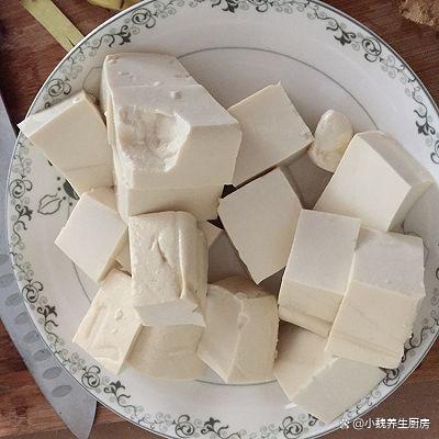 步骤1:提前选购好裙带菜,豌豆苗,牛肉和嫩豆腐,提前把买回来的豆腐泡在水中,冲洗干净,捞出切成大小相同的块状,放在碗中备用。