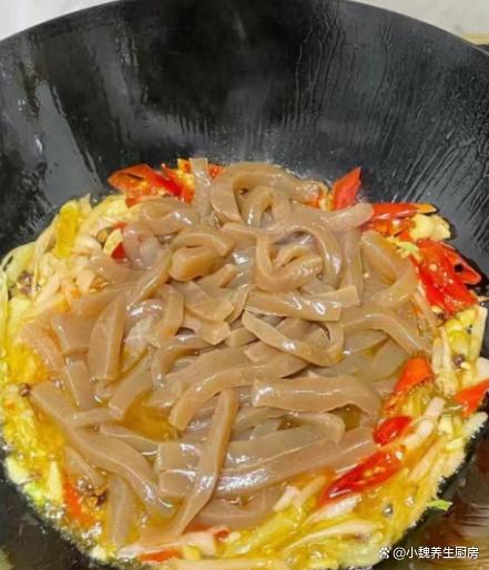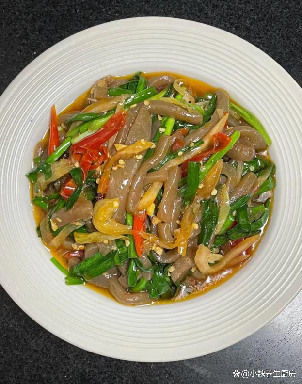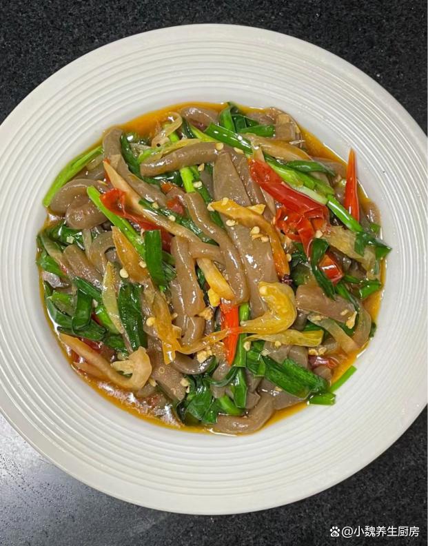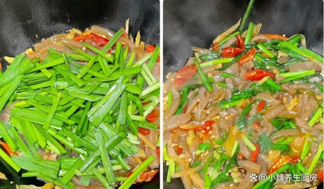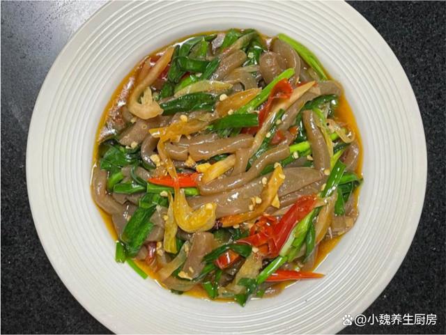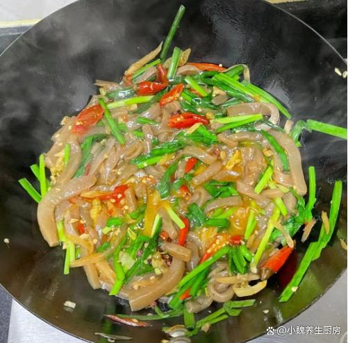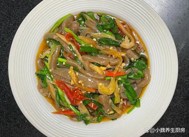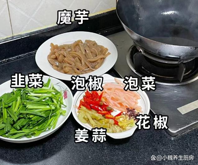 进入今年的最后一段时间,冬天最怕天冷了,最近南方也开始降温了,温度普遍都很低,最近受寒潮的影响,感觉天气太冷了,身体都被冻僵了,新陈代谢加快,食欲会非常差,不知道吃啥菜。作为一名湖南妹子,非常喜欢吃辣的菜肴,冬季天气太冷了,需要多吃一些辛辣的食物,能够刺激我们的味蕾,还能加快血液循环,对身体有好处。今天分享我们家晚餐的一道菜——韭菜泡椒炒魔芋,吃起来辛辣开胃,香味扑鼻,不懂吃可惜了。冬吃肉,不如吃韭!多给家人吃这菜,解馋开胃,孩子再也不挑食。  【韭菜泡椒炒魔芋的食谱解析】 选购一些食材:选购新鲜嫩韭菜一小把(韭菜是一种非常普通的蔬菜,一年四季都可以吃到,韭菜的叶片含有大量植物纤维,可以促进肠道的蠕动,为身体提供许多营养,还可以起到刺激味蕾的作用),魔芋250克(魔芋是低脂低卡的食材,许多减肥者的最爱,食用方法非常多),泡椒若干个,泡菜50克(泡萝卜丝),几个泡椒,花椒少许,姜蒜少许,冷水少许,食用油少许,生抽和蚝油少许,食盐和鸡精少许,其他调味品。 制作顺序: 步骤1:提前选购好韭菜,泡椒,魔芋和其他配菜,先把嫩韭菜的根部切掉,掐掉不新鲜的叶片,反复清洗干净,切成若干小段,控干表面的水分。步骤2:将泡椒和红椒切成细丝,大蒜和生姜切成细末,泡菜用流水冲洗干净,花椒清洗干净,备用。 步骤3:将魔芋清洗干净,改刀切成若干片状,然后切成长条细丝,锅中煮一些清水,倒入魔芋焯水处理,不要煮太长时间,捞出放入凉水浸泡,这样口感更好一些,控干表面的水分。
