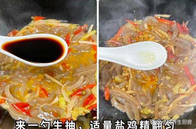 步骤4:起锅将锅底烧热,加上食用油少许,让油温慢慢烧热,放入花椒,葱姜末和泡椒,倒入一些泡菜,用锅铲煸炒一会儿。 步骤5:倒入焯水好的魔芋,大火快速爆炒一会儿,加上一勺生抽和一勺蚝油,加上鸡精一勺,加上少许食盐调味,用锅铲翻炒均匀。