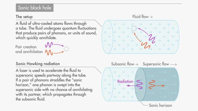 但是,正如霍金所预测的那样,要证明霍金辐射非常困难,因为与宇宙背景辐射相比,它显得非常微弱。尽管有一些反对意见,霍金辐射背后的数学原理是合理的,科学家们已经采取措施来证明这一点。在以色列理工学院的实验室里,研究霍金辐射的研究人员想出了一个办法,来克服测量真实黑洞的困难。 他们通过创造一个模拟物来做到这一点——声波黑洞,它可以模仿真实黑洞的特性。声速比光速慢得多,因此创造一种传播速度比声音快的介质要容易得多。当介质移动时,任何与它同向传播的声波都无法完全逃离它,从而创造出了声波黑洞的视界。有趣的是,霍金的数学方法适用于声波黑洞,就像适用于基于引力的黑洞一样,所以霍金辐射应该可以在声波黑洞中被探测到。