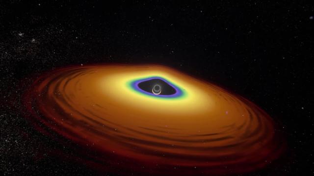 黑洞周围通常会形成一个吸积盘,吸积盘的内层边缘就是该黑洞的最内层稳定圆轨道。我们目前还不能直接测量吸积盘内边缘的直径,但我们能通过引力透镜等间接方法进行推算,从而得到黑洞的自旋。 能层就在视界上方,我们发现了一个特别奇怪的区域,叫作能层。在那里,参考系拖拽以比光速更快的速度携带着黑洞周围的空间,这意味着一切都必须朝着黑洞旋转的方向移动。这里的情况实际上类似于视界以下的状态,即空间以比光速更快的速度向下移动。在数学上,超光速的空间流动以一种特别奇怪的方式表示——空间和时间交换位置。因此,在能层中,角坐标变得像时间一样,**绕黑洞运行和在时间上倒退一样困难。