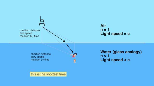 其他解释关于光的折射解释,还有一个比较常见的说法是费马原理:光遵循最短时间原理。光在空气中传播的速度比在玻璃中快,因此为了在空气和玻璃的两点之中传播时间最短,光必须弯折。教科书上经常会用水上救生员的救援路径进行比喻。