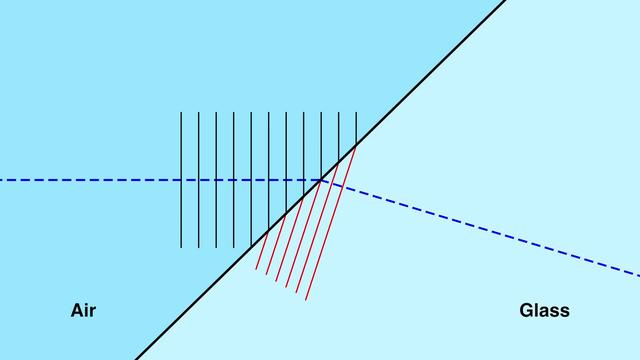 惠更斯原理请注意,玻璃中的波长较短了,因为光波在玻璃中移动的速度更慢。我们可以看到,在玻璃中,这些扩散的波叠加成了一个新的波前。我们可以多叠加几条线来显示波的传播方向,然后去除圆形波,就可以看到光从空气到玻璃时的弯折现象了。
