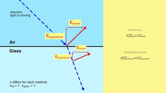 事实上,虽然惠更斯原理可以解释光的弯折,但它所预测的角度并不是唯一的,这是它的一个大问题。 麦克斯韦方程组因为玻璃中的ε比空气还大,所以玻璃中的垂直电场就更小。前面讲过,光传播的方向垂直于电场,因此我们可以画出光在玻璃中的传播方向。最后,我们可以看到,光从空气进入玻璃后会发生弯折的现象。