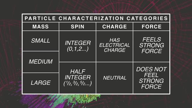 让我们先谈谈可以表征粒子的一些明显方法。首先,它们可以按质量分为大、中、小三类。其次,它们可以分为不同种类的自旋,比如说是自旋基本单位的整数倍或半整数倍。再次,它们还可以按电荷进行分类,粒子要么带有电荷,要么是中性的。最后,可以将粒子分类为是否可以感受到强力,这在历史上是很重要的。