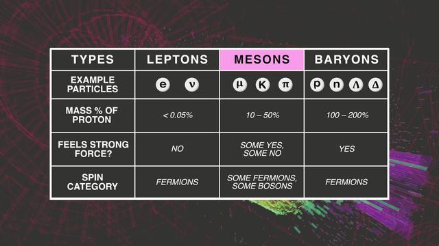 过时的质量分类法有非常轻的电子和中微子,质量不超过质子质量的0.05%。因为它是如此之小,所以这些粒子被称为轻子。相比之下,有些粒子的质量和质子相当,或者可能是质子质量的两倍,因为它们是粒子世界的胖子,所以它们被称为重子。最后,在轻子和重子之间有质量的粒子,它们的质量在大约10%到50%的质子范围内,这些粒子被称为介子,意思是介于两者之间。