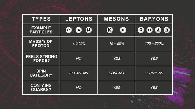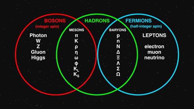 现在,这种基于质量的分类是有道理的,但事实证明它是错误的。重子可以感受到强力,而轻子则没有。介子也能感受到强力,但μ介子除外,这是一个低质量的介子,感受不到强力。能感受到强力的粒子称为强子。在自旋方面,有整数自旋的粒子在印度物理学家萨特延德拉·纳特·玻色之后被称为玻色子,他开发了描述它们相互作用的数学,并与爱因斯坦联合发表了论文。费米子是具有半整数自旋的粒子,以恩科·费米的名字进行命名,他与保罗·狄拉克一起开创了描述它们的数学。重子和轻子都是费米子,而大多数介子是玻色子,然而μ介子又搞特殊了,它是费米子。 μ介子变成了μ子夸克是自旋为1/2的费米子,自旋的方向可以向上或向下,因此他们可以有 1/2或-1/2的自旋。夸克可以感受到强力,而μ介子没有,那么很明显它属于轻子的范围而不是介子,于是μ介子变成了μ子。