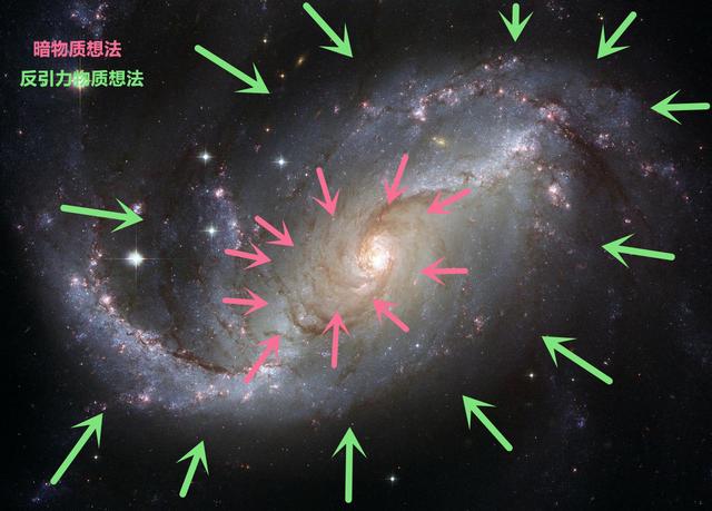 一些物理学家可能会争辩说,不能使反引力与广义相对论兼容,因为爱因斯坦理论中的粒子将始终遵循等效原理。当然,我们不能照原样在广义相对论中做到这一点。但有物理学家写了一篇论文,将广义相对论扩展到反引力物质,给等价原理的引力质量多加了一个绝对值。所以,这在理论上是可能的,真正的问题是,我们看不到任何反引力物质。 反物质=反引力物质?我们周围的反物质如此之少,而且它存在的时间这么短,我们怎么知道它不是反引力物质呢?中子和质子是由三个夸克所组成,其中还有一种粒子汤将夸克结合在一起。汤中的一些粒子是反粒子,它们无时无刻都在被创造和湮灭。因此,我们称它们为虚拟粒子,但它们仍然对中子和质子的引力质量做出了巨大贡献。这意味着,有些人认为,反引力物质与目前尚未清楚的暗物质、暗能量有些相似。反引力物质可以围绕正常星系运转并产生斥力挤压它们,这会产生一种看起来很像暗物质的额外力。通常,我们观察到的这些额外力被认为是由星系内部和周围更多的正质量引起的。内部更多正质量的吸引,还是外部负质量的推入,都可以产生相同的暗物质效果。