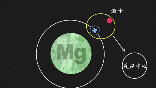 通常我们认为镁离子是一个整体,它只是失去了一个电子而带正电。但为了让这一切有意义,我们需要稍微重新构建它。把它想象成一个中性镁、一个电子和一个带正电的空穴在电子的位置。这时候,空穴和电子被称为激子,它可以储存能量。为了从阳光中获取能量,植物需要将该激子送到反应中心,以进行电荷分离的过程。这个过程涉及从镁中获取电子并将其转移到附近的一些分子,以便它可以产生稳定的分子,那里就是产生光合作用的化学过程。