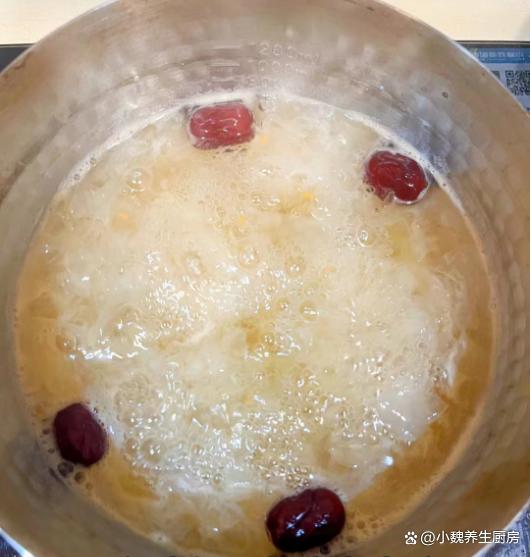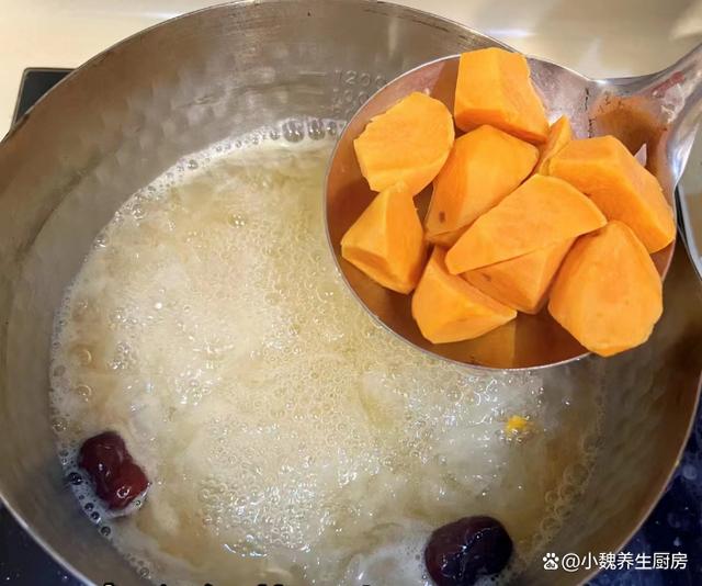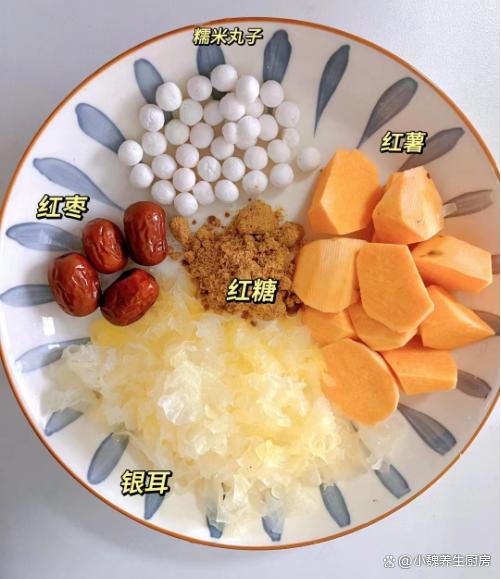 一年四季,岁月如梭,转眼就来到今年的尾声——冬季,冬季也分为几个阶段,仲冬是冬季的第二阶段,是慢慢开始转凉的时候,气温出现急速降低,昼夜的温差越来越大,白天也不暖和,感觉空气特别潮湿,皮肤十分干枯,口干舌燥,女性的脸部苍白,还会出现贫血的情况。十个女性,九个都爱美,气血决定人的形象,冬天一定要给适当进补,多吃新鲜蔬菜和肉类,还可以给家里人试试这款甜汤——红薯糯米小丸子银耳汤,每年家里的红薯吃不完,可以用来制作甜汤,喝起来暖身暖胃,好处多多。冬季转凉,女性要多喝这汤,甘甜滋补,营养全面,肌肤红润细腻。  【红薯糯米小丸子银耳汤的食谱解析】 食材清单:选购新鲜红薯200克(红薯又叫地瓜,是冬天最受欢迎的食材,烤火的时候可以烤地瓜,还可以蒸和煮着吃,红薯的糖分适中,含有大量的营养和膳食纤维,每天吃也不会长胖),选购120克糯米粉(糯米粉是以糯米为原材料,糯米粉可以制作各种甜点,还可以做成小汤圆,吃起来口感软糯,糯叽叽的,我们家孩子超爱吃),红糖少许,若干个红枣,一朵银耳(银耳又叫白木耳,被称为“补血之王”,银耳的铁元素含量高,促进血红蛋白生成,补血养颜,改善贫血的情况),冷水和温水少许,冰糖少许,其他。