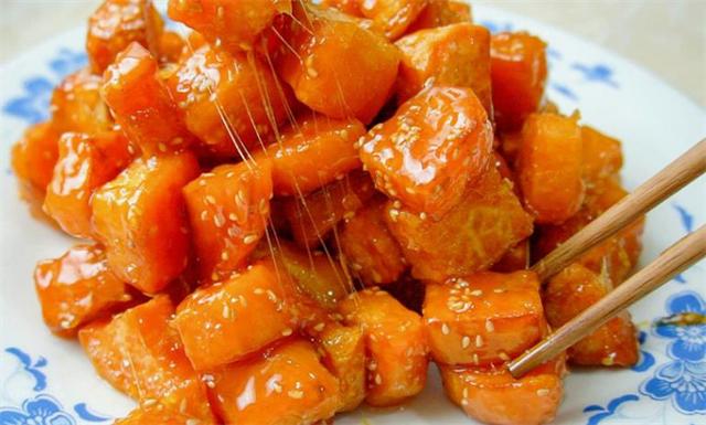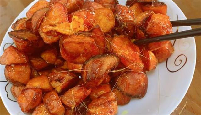 第二步是炸红薯。将油倒入锅中,油温控制在180-200℃之间。然后将红薯块放入锅中,用中火炸至金黄色和脆皮。