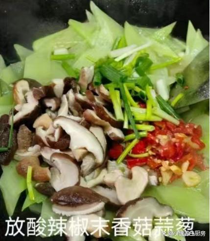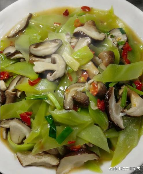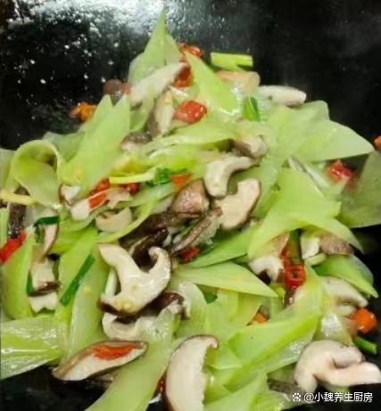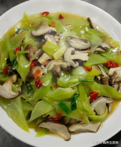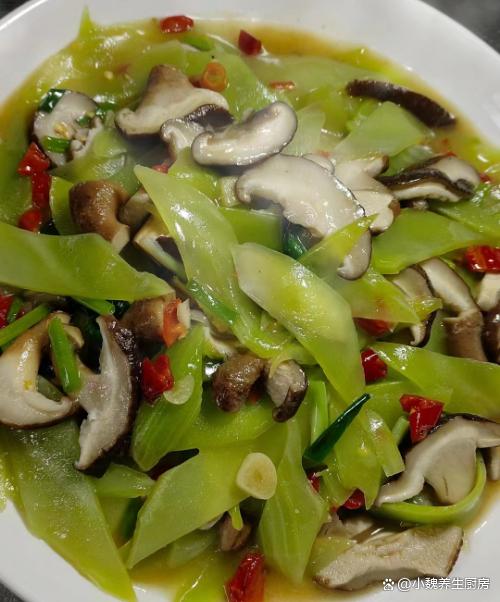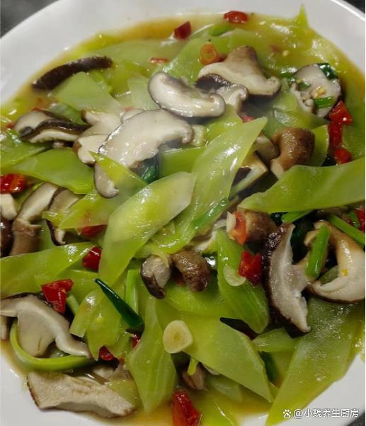 进入寒冬模式,很多人还没有反应过来,冷空气就开始席卷各地,不仅仅北方开始降温,各地都开始降温了,天气越来越冷,空气都是干燥的,加上有一阵阵的狂风,身体容易缺乏水分和营养。每年十一月份,都是网购高峰期,我们行业非常繁忙,经常加班熬夜,工作压力非常大,白天容易犯困,晚上容易睡不着,经常出现失眠的情况。失眠是困扰很多中老年人的问题,失眠的人压力很大,平常要注意饮食,多吃一些清淡的菜肴,冬天要多吃菠菜,油麦菜和莴苣等等。今天准备用莴苣和香菇制作一道拿手菜——莴苣炒香菇,此菜做法很简单,清淡爽口,百吃不腻。寒冬,遇见这菜别手软,简单炒一盘,清淡爽口,错过太可惜了。  【莴苣炒香菇的食谱解析】 食材明细:选购新鲜莴苣几根(莴苣是一种菊科的根茎类蔬菜,莴笋全身都是宝,叶子和根茎都可以做成美食,多吃莴苣对失眠有好处,吃起来口感清脆,每天吃都不长肉),猪油渣少许,新鲜香菇150克左右(香菇是最受欢迎的菌菇之一,烹饪方法有很多,荤素都能够搭配,吃起来鲜嫩细腻),冷水少许,食盐若干,小米辣若干个,一些大蒜头,生姜一小块,食用油少许,鸡精和味精各半勺,少许胡椒粉,其他调味品。