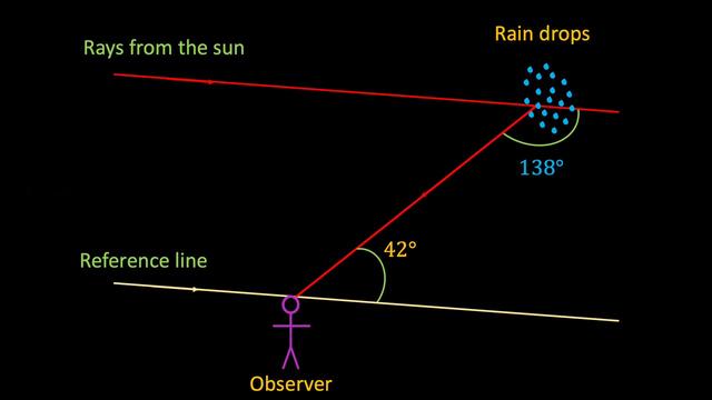 这种具有138度偏转角的光线积累意味着此角度的红光更亮更明显,与之对应的观测角42度被称为红光的彩虹角,也就是我们看到红光的最佳角度。此外,通过这种方法,我们也可以算得蓝光的彩虹角大约为40度。在这两个角度之间,我们就可以看到完整的彩虹。