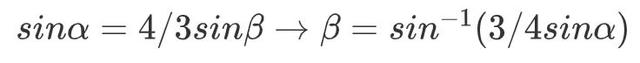彩虹角的计算我们可以再利用斯涅尔定律,让空气的折射率为1,水对红光的折射率为4/3,于是可以得到: