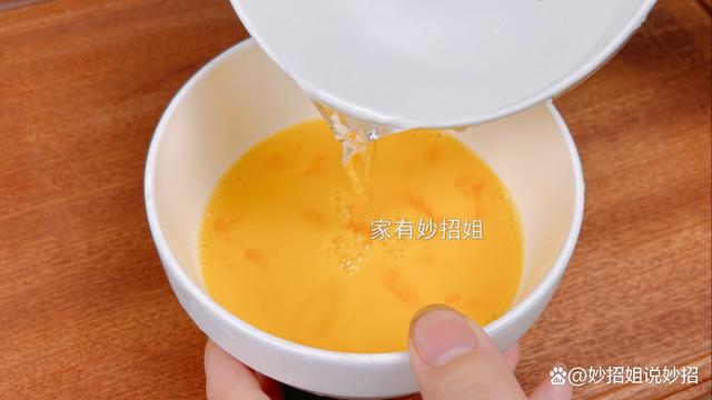 第二步:鸡蛋搅散后我们就需要往里面加水了。很多朋友都不知道具体该加多少水,通常就是凭着感觉加的水。但这样就会出现水加多了,鸡蛋羹不成型的情况;或者是水加少了,鸡蛋羹硬邦邦的,一点也不Q弹。其实蒸鸡蛋羹最好的蛋液与水比例是1:1.5,要是不好准备的把握这个1.5的水,我们也可以另外拿个同样的碗,在碗里倒入比鸡蛋液多一半的水,然后再倒入鸡蛋羹中就可以了。