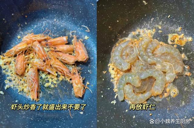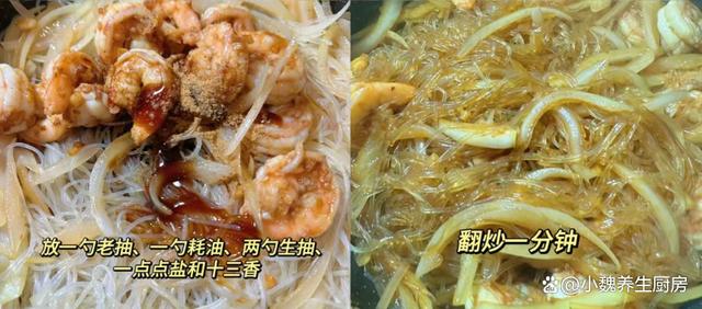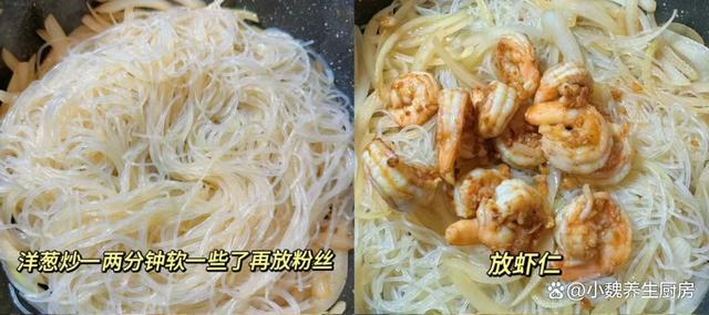 第四步:锅底预热,加上植物油少许,油温慢慢烧热,放入葱花和蒜末,倒入虾头炒出红油,然后挑出虾头。 第五步:倒入腌制好的虾仁,煎至色泽变红,盛出备用,锅底加上油,放入一些洋葱丝,将其炒出葱香味,将其炒至变软。 第六步:倒入泡好的粉丝和煎好的虾仁,加上一勺老抽,两勺生抽和一勺蚝油,加上一丢丢食盐和十三香,用锅铲翻炒一分钟。 第七步:最后放入香葱和香葱,收汁,关火出锅,这道虾仁炒粉丝就出锅了,粉丝非常有弹性,吃起来味道太绝了。 虾仁炒粉丝是我们家孩子爱吃的菜肴之一,虾仁的肉质十分鲜嫩,粉丝非常有弹性,香辣入味,营养又美味,吃起来很下饭,越吃越过瘾。 (www.ws46.Com)