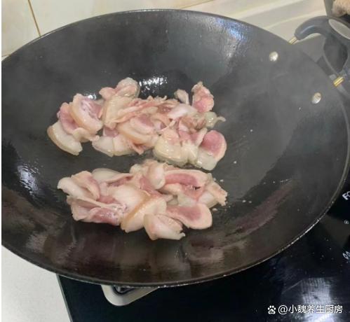 步骤4:锅中大火烧热,加上适量植物油,让油温烧热到7成热,倒入五花肉快速煸炒出肥油,多余的油脂要舀出来,不然会感觉吃起来非常腻。