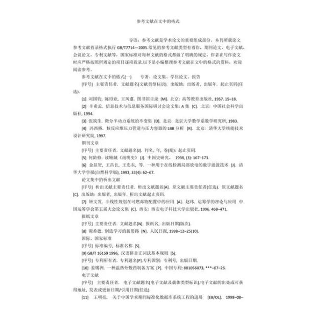 2、参考文献格式: (1)在前面加上序号,就是你引用的第几个文献,格式是:[数字],注意[]是英文状态下的。 (2)然后书写主要作者,如果是国际/国家标准的话,要书写标准代号。 (3)之后要打上一个点,注意不要打成句号了。 (4)接着写的是你所参考文献的文献名。 (5)之后写上你文献的类型,格式是:[类型] 。 (6)之后打上点,写上出版地方:出版社,出版日期。 (7)之后需要写上你参考文献的起止页码,在出版日期后写上:开始页-结束页,最后还要打上一个点作为结束。