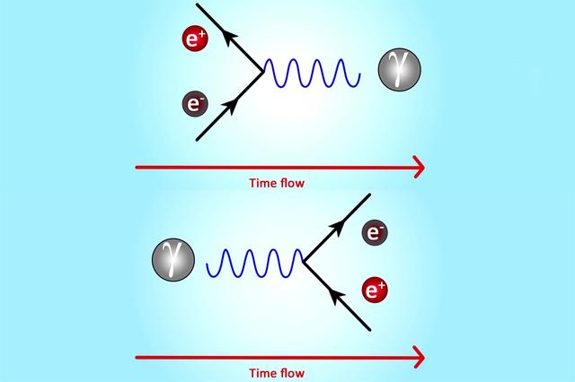 但是当从真空中创造物质时,它也会产生等量的反物质。反物质就像物质一样,只是带有相反的电荷。例如,电子的反物质等价物是正电子,它就像电子一样,只是带正电荷而不是负电荷。同样,还有反中微子和反夸克。当物质和反物质碰撞时,它们会相互湮灭产生巨大的能量。一个简单的费曼图可以用来表示该过程,我们也可以将该图颠倒过来:能量变成物质和反物质。