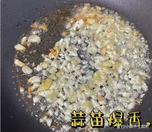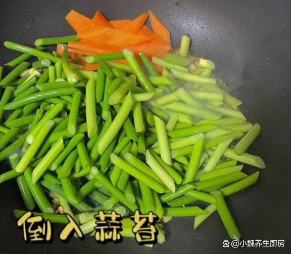 第六步:锅中继续加上油,放入蒜末和姜末,倒入胡萝卜和蒜苔,将其大火炒至断生。