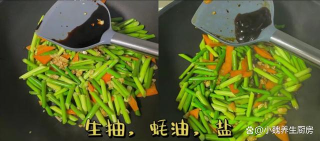 第七步:加上一勺生抽和蚝油,调入半勺白糖和一勺食盐,加上半勺鸡精,最后倒入提前炒熟的鸡蛋块。第八步:用锅铲迅速翻炒均匀,关火出锅,这道蒜苔胡萝卜炒鸡蛋就制作完成了。 蒜苔胡萝卜炒鸡蛋是一道非常开胃家常菜,主要选用蒜苔,胡萝卜和鸡蛋一起吃,口感非常独特,香味扑鼻,菜色很好看,吃起来超级脆口,开胃下饭,补充各种营养,吃起来美味又健康,早食早受益。