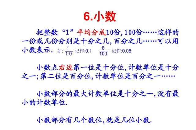 根据十进制的位值原则,把十进分数仿照整数的写法写成不带分母的形式,这样的数叫做小数,小数中的圆点叫做小数点,它是一个小数的整数部分和小数部分的分界号,小数点左边的部分是整数部分,小数点右边的部分是小数部分,整数部分是零的小数叫做纯小数,整数部分不是零的小数叫做带小数,例如0.3是纯小数,3.1是带小数。 小数的定义: 小数,是实数的一种特殊的表现形式。所有分数都可以表示成小数,小数中除无限不循环小数外都可以表示成分数。无理数为无限不循环小数。 小数的组成: 小数由整数部分、小数部分和小数点组成。小数中的圆点叫做小数点,它是一个小数的整数部分和小数部分的分界号。其中整数部分是零的小数叫做纯小数,整数部分不是零的小数叫做带小数。