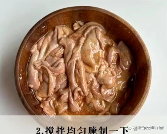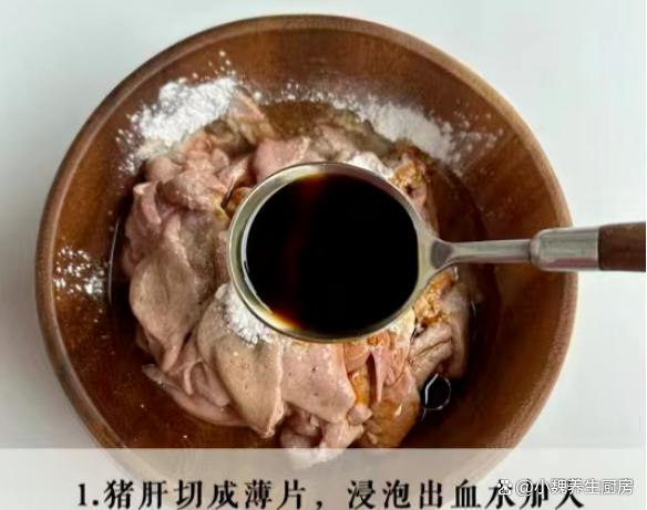 步骤4:将猪肝片搁在容器中,加上原味酱油一勺,加上少许辅食油,加上食盐一小勺,调入玉米淀粉少许,用手快速抓拌均匀,腌制入味即可。