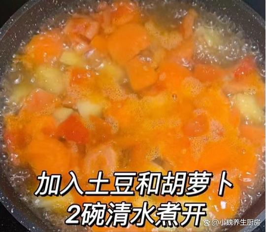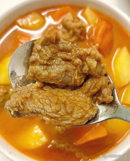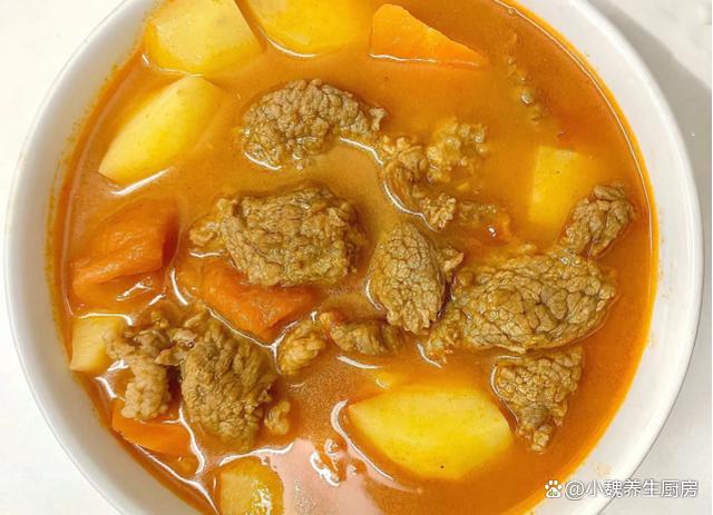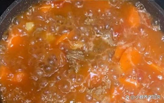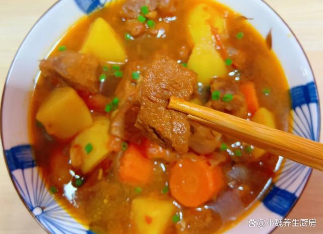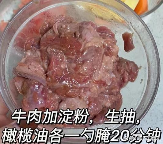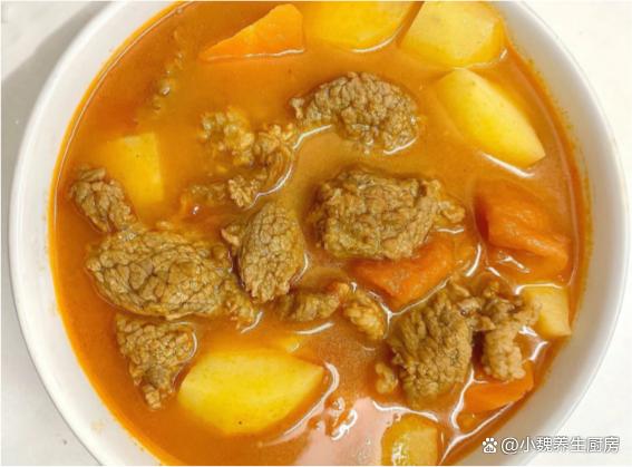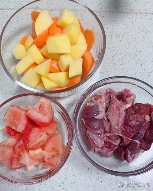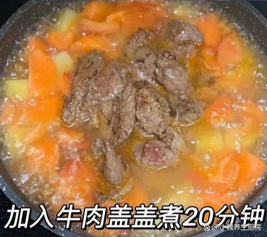 进入11月份之后,我们要盼来寒冷的冬季,冬季来临,寒潮来袭,冷空气南下,每天早上起来都是雾蒙蒙的,晚上特别阴冷,让人措手不及,感觉早上起床需要勇气。入冬之后,天气渐渐变得寒冷,一定要注意保暖,避免平常生病了,这个时候要适当进补,为身体提供能量,提高身体的免疫力,抵抗寒冬的侵袭。今天分享我们家每周必吃的家常美食——番茄胡萝卜土豆炖牛肉,主要选用土豆,番茄,胡萝卜和牛肉制作而成,牛肉软烂入味,汤汁也非常浓稠,吃起来很过瘾。入冬后,有钱没钱,常给家人吃这菜,营养美味,为冬天打好基础。  【番茄胡萝卜土豆炖牛肉的食谱解析】 食材清单:选购新鲜土豆250克左右(土豆是日常生活最普通的蔬菜,家家户户都吃得起,淀粉含量高,有很多种烹饪方式,许多南方人喜欢炖着吃),选购新鲜番茄一个,胡萝卜2根,冷水和温水少许,番茄酱半勺,选购新鲜牛腿肉300克左右(或者选择牛肉里脊或牛腩),少许食用油,生粉和淀粉少许,生抽和老抽少许,香葱若干根,胡椒粉少许,鸡精半勺,姜片少许,食盐若干,其他佐料。 正确制作顺序: 第一步:提前选购好新鲜牛肉,番茄,土豆和胡萝卜,先把番茄顶部切一个口子,用开水把外皮烫一烫,去皮切成小丁,能够方便快速炒出汁水。 第二步:先把牛肉彻底清洗干净,剃掉多余的部位,切成若干小丁,牛肉丁放在容器中,将牛肉腌制入味。第三步:两根胡萝卜反复清洗干净,去掉胡萝卜的外皮,改刀切成滚刀块,土豆去掉外皮,洗净切成小方块,用冷水浸泡一会儿,搓洗掉表面的淀粉,控干表面的水分。 第四步:锅底刷上少许食用油,让油温慢慢烧热,放入一些生姜丝,倒入牛肉丁快速爆炒,将牛肉炒至变色,盛出。