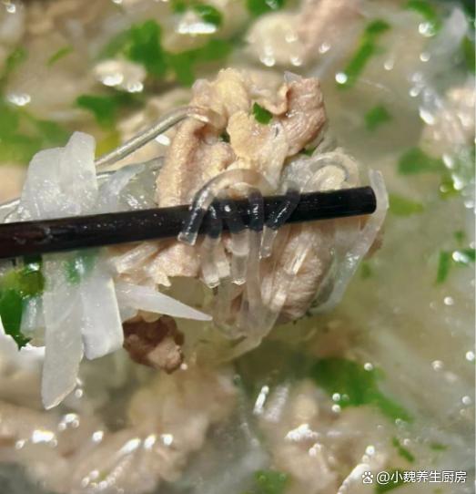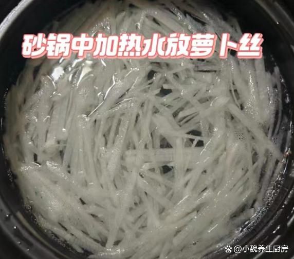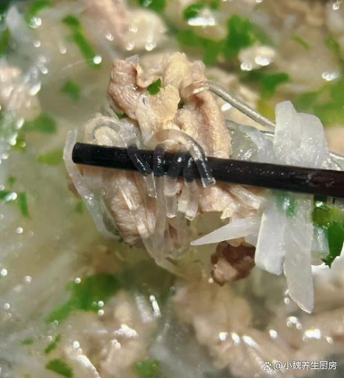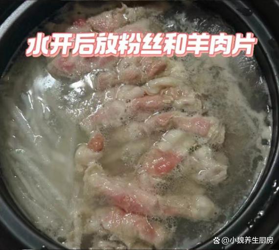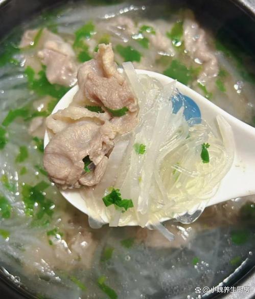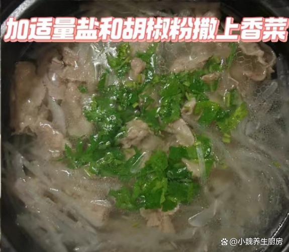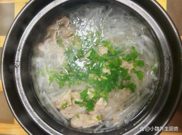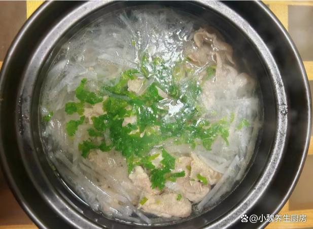 第四步:起锅提前烧热,加上植物油和猪油,放入姜末和葱白,煸炒出香味来,加上适量清水煮开。 第五步:将萝卜丝煮至变软,水开后放入泡好的粉丝,放入一些肥牛卷,小火煮几分钟。 第六步:用勺子撇去浮沫,调入味极鲜半勺,加上半勺鸡精,调入胡椒粉和其他佐料,放入葱花和香菜,焖煮一分钟即可。第七步:关火出锅,这款白萝卜丝粉丝肥牛卷汤就烹饪完成了。 白萝卜丝粉丝肥牛卷汤是一款时令鲜汤,主要采用白萝卜,粉丝和肥牛卷烹饪而成,汤汁十分鲜美,秋天喝非常润燥,滋补养生,暖身驱寒,帮你身体越来越强壮。 白萝卜试试这样吃,简单炖一锅,营养又好喝,老少皆宜,错过吃太可惜了。你们是否喝过这款白萝卜丝粉丝肥牛卷汤?(以上配图均出自网络)