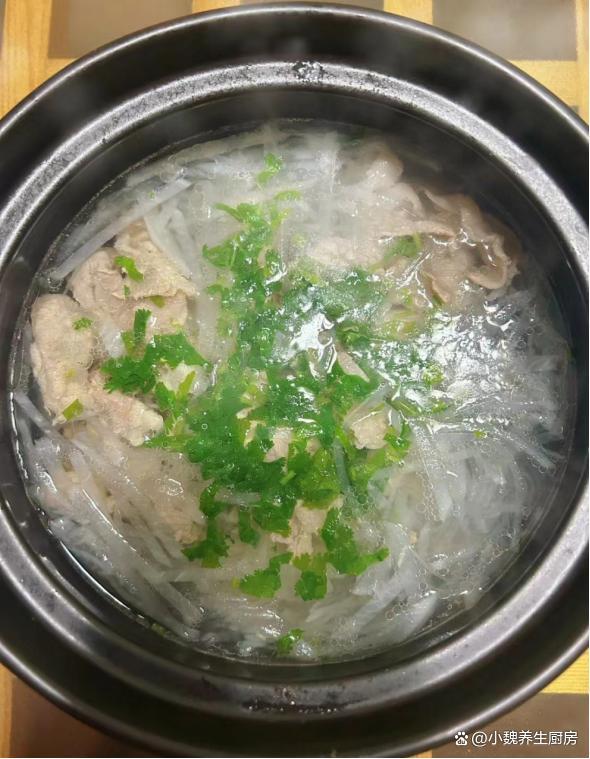 进入十一月以后,正式进入到冬天,阳气减退,身体就会出现四肢无力,手脚冻伤了,脸部非常粗糙,缺少大量的水分和营养。冬天是最寒冷的季节,我们身体抵抗力差,许多疾病入侵身体。长辈们说“冬天进补,来年打虎”,冬天是最佳的时候,趁着最佳的养生期,多给家里人喝汤,比如说这款白萝卜丝粉丝肥牛卷汤,白萝卜是应季的时令蔬菜,口感十分清甜,喝起来巨鲜美。许多人肯定没有喝过这款白萝卜丝粉丝肥牛卷汤,到底应该如何烹饪呢?赶紧给家里人做一做哦。冬天进补,建议多喝“这汤”,简单炖一锅,营养又鲜美,别不懂吃。  【白萝卜丝粉丝肥牛卷汤的食谱解析】 食材清单:选购水分足的白萝卜一根(白萝卜是冬季最该吃的蔬菜,根茎和叶子都能够食用,根茎非常清甜多汁,吃萝卜胜过吃大鱼大肉,冬天炖汤非常滋补甘甜,对嗓子有好处),粉丝一卷,冷水或开水少许,肥牛卷250克左右(或者选择牛肉或猪肉),小葱若干根,食用油少许,猪油一勺,香菜几根,味极鲜少许,食盐和胡椒粉少许,其他调味品。
