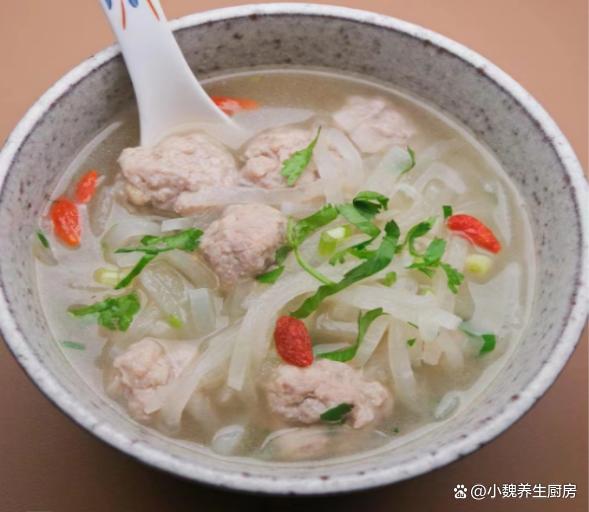 进入11月份以后,距离新年的脚步更近了,明日就要迎来立冬节气,顾名思义就是冬天的开端,冬天从这一天开始,虽然还没有达到寒冷的时候,但是气温会一直在降低,温度已经低于15摄氏度,身体十分疲惫,感觉一整天都没有力气。秋冬交替的时候,我们的脾胃不和,身体状态很差,尤其是入冬以后,一定要多喝暖和和的羹汤,今天准备用白萝卜,莲藕和猪肉里脊制作一款家常汤品——白萝卜莲藕肉丸汤,做法超级简单,汤汁十分好喝,不懂吃怪可惜的。许多人肯定没有喝过这款白萝卜莲藕肉丸汤,跟着小编学起来哦。明日立冬,有钱没钱,常给家人喝这汤,暖胃暖身,增强抵抗力。  【白萝卜莲藕肉丸汤的详细做法】 食材明细:选购一节莲藕(莲藕是秋天的“三宝”,也被称为“水中人参”,多吃莲藕对身体好,口感十分清甜,既可以用来炖汤,煮肉丸子可以加一点点,让口感更好吃),选购白萝卜320克左右(白萝卜是非常平价的时令菜,冬天是吃萝卜的好时机,多吃对身体有益处),选购半斤新鲜里脊肉(建议选择猪肉,里脊肉的肉质十分鲜嫩,做成肉丸子很好吃),香葱若干根,生姜半块,冷水少许,几个花椒,食盐少许,半勺白胡椒粉,一小把枸杞子,其他。 正确做法:1:提前准备好新鲜莲藕,白萝卜和猪肉里脊,先把几片生姜切成细末,小葱洗净切成细葱花,准备好一个空碗,加上少许清水,放入生姜,花椒和葱段,浸泡一小会儿,葱姜水能够起到去腥的效果。2:白萝卜用工具去皮,切成若干细丝,用盐水浸泡,最后捞出控干水分,莲藕去皮洗净,剁碎成细末,放在容器备用。 3:将猪肉里脊切成小块,将其彻底洗干净,剁碎成猪肉末,猪肉末放在器皿里,加上少许葱姜水,加上莲藕泥,加上生抽一勺和半勺蚝油,调入半勺鸡精,一勺食盐,调入一丢丢胡椒粉,最后放入姜末和葱花,用筷子搅拌均匀,放置一小会儿。 4:锅底调入适量食用油,放入一些葱花,倒入一些白萝卜丝,快速将其炒软,盛出备用。