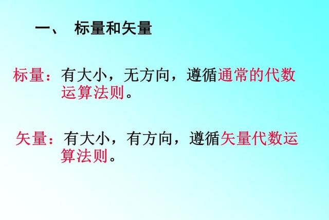 矢量的减法是指将一个矢量从另一个矢量中减去得到一个新的矢量。在二维平面中,矢量的减法可以通过将减去的矢量取反后与另一个矢量相加来计算,在三维空间中,矢量的减法也是类似的,矢量的标量积是指将两个矢量相乘得到一个标量,在二维平面中,矢量的标量积可以通过将两个矢量的模相乘再乘以它们的夹角的余弦值来计算,在三维空间中,矢量的标量积也是类似的。 矢量的向量积是指将两个矢量相乘得到一个新的矢量,在二维平面中,矢量的向量积为0,在三维空间中,矢量的向量积可以通过将两个矢量的模相乘再乘以它们的夹角的正弦值来计算,矢量在物理学中的应用非常广泛,例如力、速度、加速度等物理量都可以用矢量来描述。