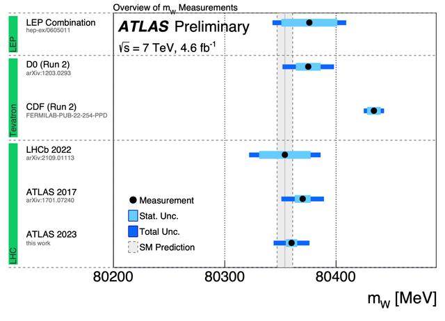 近日,欧洲核子研究中心的ATLAS实验室发布了一项新的研究结果,对W玻色子的质量进行了改进的再分析。ATLAS发现W玻色子的质量为80360 MeV,不确定度为16MeV。这是目前世界上最精确的单个实验测量结果,也与标准模型预测值80357±6 MeV非常接近。 然而,这一结果与去年费米实验室的CDF实验结果形成了鲜明对比。它们利用2002年到2011年期间CDF探测器的实验数据,对大约400万个W玻色子进行十余年分析,最终给出了W玻色子质量的测量结果,这也是第一个将误差降低到个位数(9 MeV)的实验。然而,CDF合作组所测量的W玻色子质量为80434±9 MeV,比标准模型预期值高出了7个标准偏差。如果这一结果被证实,将预示着标准模型需要被修正或扩展。