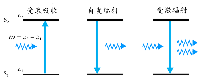 那么,电子跃迁是怎么发生的呢?根据能量守恒原理,粒子的外层电子从低能级转移到高能级的过程中会吸收能量;从高能级转移到低能级则会释放能量。那么问题来了:既然电子得到了更多的能量,并且存在于更高的轨道上,为什么它不能一直保持在那里呢?为什么它还要再次释放掉多余的能量,并且回到低能级轨道呢? 举个例子,如果我们用一束光照射一个氢原子,那么这束光就相当于一个微扰。它会使得氢原子中的电子受到一个周期性的电场力作用,从而改变它在不同轨道上运动的概率。如果这束光的频率刚好等于两个轨道之间能量差所对应的频率,那么就有很大可能性触发电子吸收一个光子,从低能级跳到高能级,这就是受激吸收。反之,如果电子本来就在高能级上,并且遇到了一个与其能量差相同频率的光波,那么它也有很大可能性释放出一个光子,并且回到低能级上,这就是受激辐射。