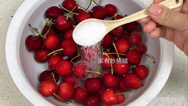 樱桃经过冲洗后,我们再把它倒在一个大点的容器中,然后往里接入没过樱桃的水,再往里面倒入一小勺的食用盐。食盐大家都很熟悉,它具有消毒杀菌的作用,可以有效地将附着在樱桃表面的一些虫卵消灭,而且盐水还会刺激隐藏在樱桃里面的小虫子,让小虫子能自动跑出来。