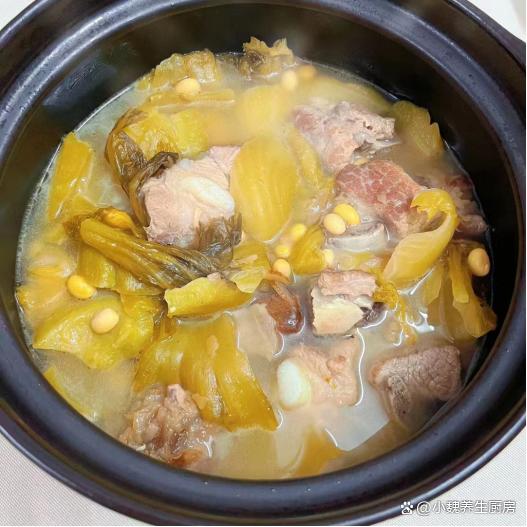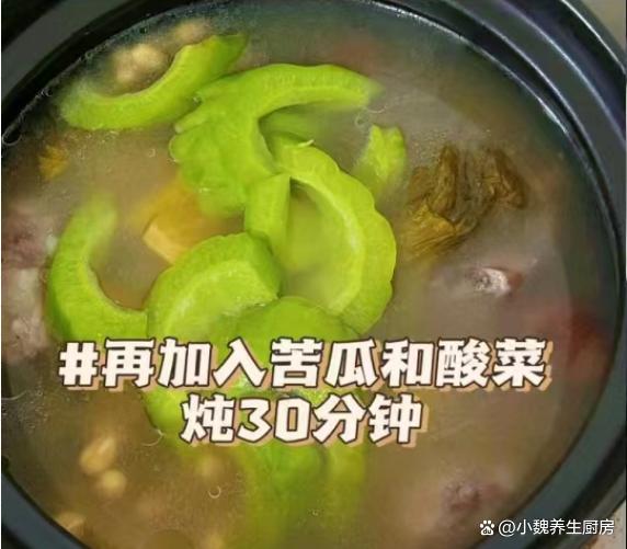 5:准备好砂锅一个,锅中放入排骨块,泡好的黄豆,几个蜜枣,加上足量纯净水,盖上锅盖大火煮开,小火炖一个小时。 6:放入一些苦瓜和酸菜,也可以加入一些水,继续小火焖煮30分钟,一定要掌握好火候,等待汤汁慢慢变色,排骨煮至软烂。 7:出锅之前加上盐,胡椒粉和其他佐料,关火盛出,这道黄豆苦瓜酸菜排骨汤就制作完成了。 黄豆苦瓜酸菜排骨汤是一款很受欢迎的靓汤,尤其是中老年人要多喝,汤色浓郁,排骨软烂入味,汤品全身营养,喝起来鲜美极了,让人大饱口福,食欲越来越好,赶快给家里人尝一尝吧。小伙伴们,你们是否喝过这款黄豆苦瓜酸菜排骨汤呢?(文中配图都来自网络)