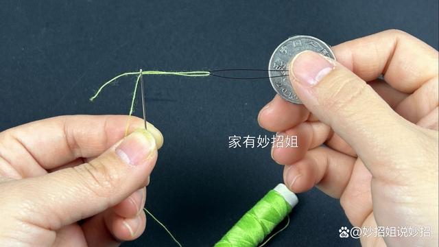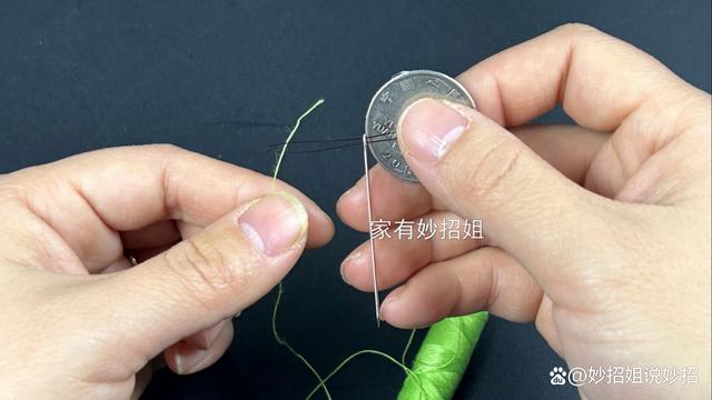 当需要穿针的时候,我们只要抓住硬币,将硬币上固定的细丝穿入针眼。这根扫把丝不仅细小,而且有一定的硬度,它就能很轻松地穿过针眼了。接下来,我们再将要穿的线,放入扫把丝折叠痕迹的中间。