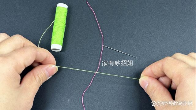 技巧一:旧线头穿针法。 每次在使用完针线后,都会在针上残留一小段的线头,这个线头就不要扯掉了,我们就可以利用它来穿新线。方法很简单,我们先将针放在桌面,然后把两边的线头往两边伸展开,接着把要穿的新线搭在其中一边的旧线头上。