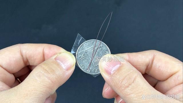 技巧四:硬币穿针法。 我们还可以利用一枚硬币改造一个非常好用的穿针工具。方法很简单,我们先拿个一元的硬币,然后在扫把上扯下来一根细丝。把细丝从中间对折后,用胶布把细丝固定在硬币上面,扫把丝折叠的部分留出来一点。固定好,这样一个穿针的工具就制作好了。