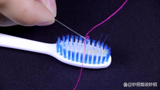 技巧二:牙刷穿针法。 牙刷就是我们每个人都必不可少的日常清洁用品了,其实牙刷也能帮助我们将线快速穿过针眼。方法很简单,我们先将牙刷放在桌面,将刷毛朝上,然后再将需要穿的线随意搭在刷毛的上方。接着,我们再将针眼对准线的位置往下慢慢按压。由于牙刷的刷毛非常细小,针眼中能同时穿入很多刷毛,我们将新线搭在刷毛上,在用针眼对准线按压的过程中,刷毛就起到了一个支撑的作用,这样线就会随着刷毛一起穿过针眼了。