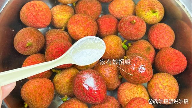 食盐倒好,我们用手搅拌一下,使食盐充分的溶解在水中,接下来,就这样让荔枝在淡盐水中浸泡上五分钟。这一步的目的,其实就是因为食盐具有杀菌消毒的作用,它可以将荔枝表面的一些细菌、虫卵之类的消灭,也就会更有利于荔枝的保存。