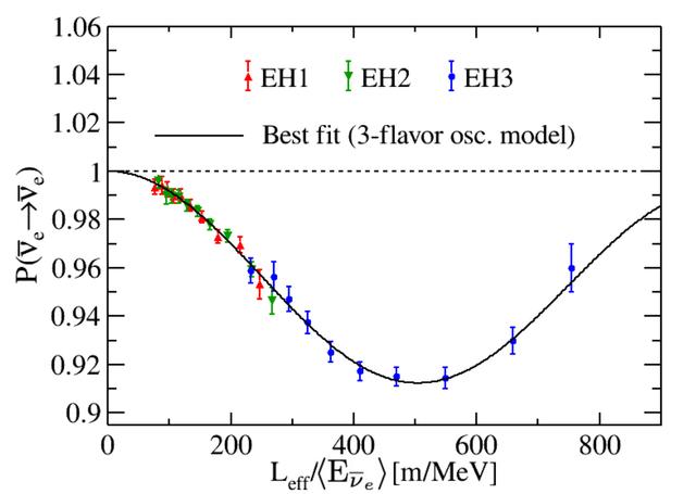 不同的中微子源有不同的能谱和强度,因此可以探测不同的振荡模式和频率。通过比较不同距离处探测到的中微子信号,我们可以计算出中微子振荡的概率,并从中提取出相关的参数。 大亚湾实验就是一个反应堆中微子实验,它利用广东省的核电站产生的电子反中微子,通过八个探测器分别布置在三个不同的距离上,测量电子反中微子的存活概率和消失概率,从而测量中微子混合角θ₁₃。大亚湾实验通过对比不同距离上探测器观测到的电子反中微子数目,以及它们的能谱分布,来拟合出θ₁₃的最佳值和误差范围。