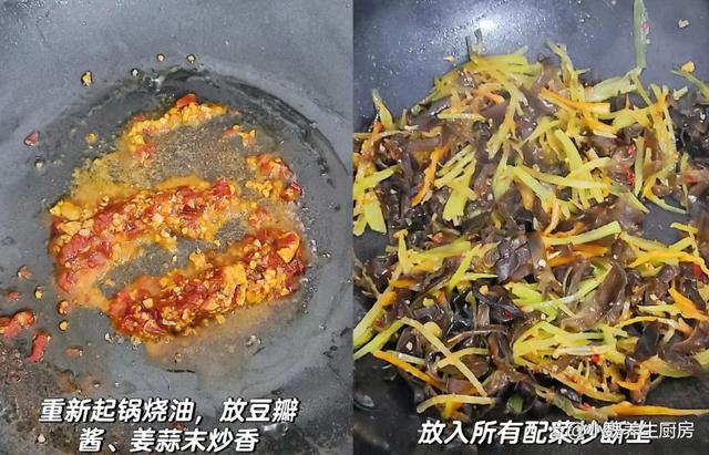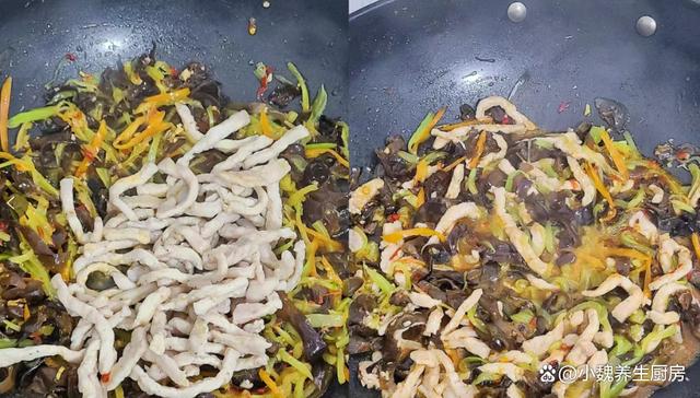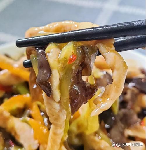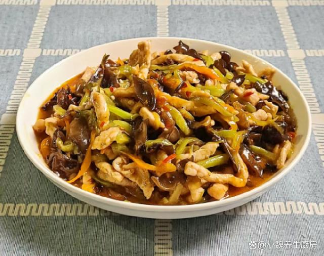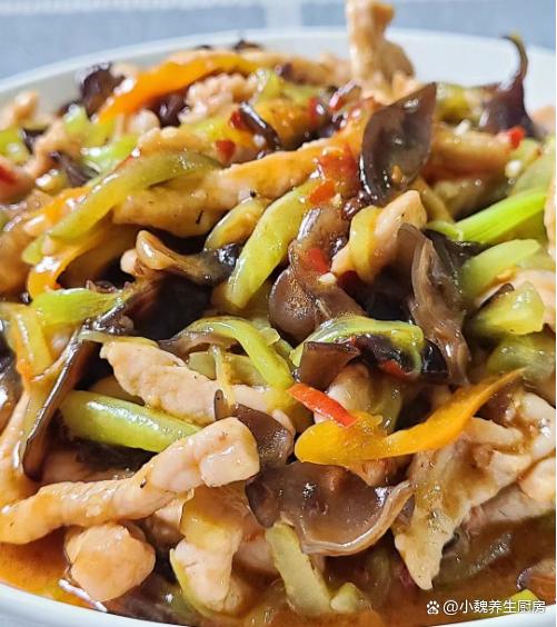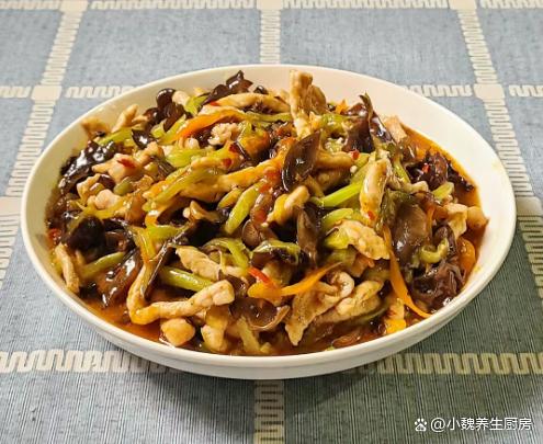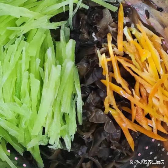 具体制作顺序:步骤1:提前挑选好猪肉里脊,青笋,胡萝卜和木耳,先把青笋的椰汁掰掉,用刀去掉一层外皮和白茎,洗净切成片状,改刀切成若干细丝,青笋丝用盐水泡一泡,最后控干表面的水分。步骤2:将黑木耳温水泡发变软,去掉黑色的根蒂,或者将黑木耳焯烫处理,这样黑木耳吃起来更好,洗净切成细丝,备用。 步骤3:胡萝卜洗净去皮,切掉两头洗干净,然后切成胡萝卜丝,一些大蒜头切成蒜末,生姜切成细段,备用。 步骤4:里脊肉用清水洗干净,顺着纹路切成片,然后切成若干细丝,瘦肉丝放在容器中,加上盐和胡椒粉,调入少许料酒去腥,最后加上淀粉,把瘦肉丝抓拌一会儿,这样肉丝鲜嫩美味,不容易粘锅。 步骤5:提前调配一碗料汁,碗中加上生抽一勺,半勺陈醋,一勺白糖,一勺料酒,少许淀粉,加上清水,用勺子搅拌均匀。 步骤6:另外起锅烧热,加上冷油烧热,倒入腌制好的瘦肉丝,大火把肉丝炒至变色,出锅装盘备用。 来源: www.ws46.com 步骤7:锅底留一些食用油,加上一勺豆瓣酱炒香,加上蒜末和姜末炒香,倒入青笋丝,胡萝卜丝和黑木耳丝,迅速翻炒均匀。 步骤8:最后倒入炒熟的肉丝,淋入调好的酱料汁,用锅铲快速翻炒片刻,大火收汁,装盘出锅,这道青笋胡萝卜木耳炒肉丝就制作完成了。 青笋胡萝卜木耳炒肉丝是一道超级美味的菜肴,色香味俱全,肉丝鲜嫩美味,营养搭配,补充钙铁元素,蛋白质和维生素,吃起来超级解腻,作为下饭菜很不错。 小伙伴们,你们是否吃过这道青笋胡萝卜木耳炒肉丝吗?(全文配图都出自网络)