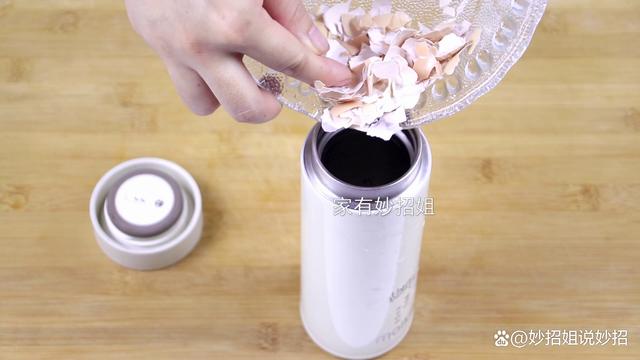 妙用四:清洁保温杯。 家里的保温杯使用的时间长了,在杯底就会产生很多水垢。如果不清洁干净的话,不仅会影响水质,还可能产生异味。但由于保温杯的杯口小,杯底深,要是没有专门的工具,还很难清洁到底部。其实清洗保温杯,利用上鸡蛋壳就可以了。我们先在保温杯中接入小半壶的热水,然后再准备一个鸡蛋壳,把鸡蛋壳捏碎后放在保温杯里。