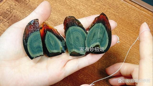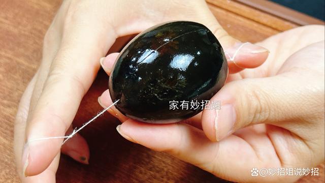 接着,我们再将皮蛋的外壳剥掉,把皮蛋抓在手上。另一只手的食指和大拇指,分别穿进棉线预留的小圈中。接下来,我们只需要把棉线压在皮蛋上,然后慢慢的往下压,这样皮蛋就被切开,一分为二了。